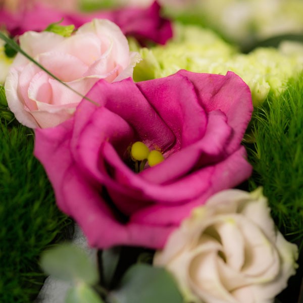 Composition : Roses mauves, œillets verts, œillets roses, ornithogalums, lysianthus roses, feuillages.