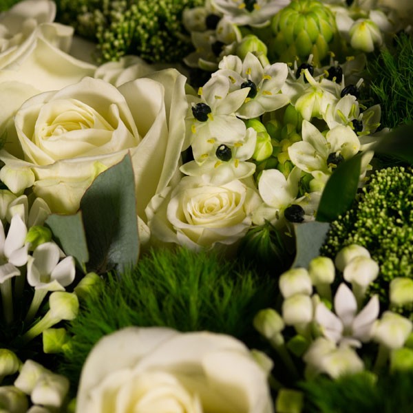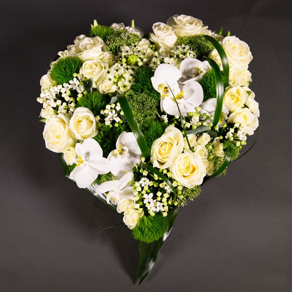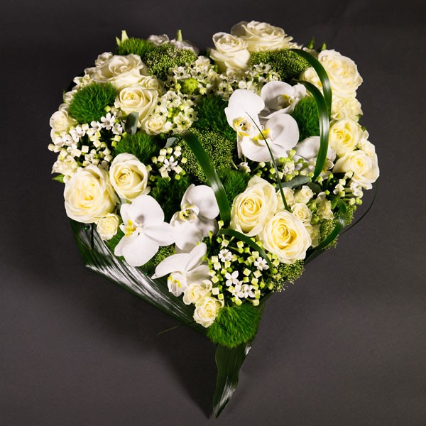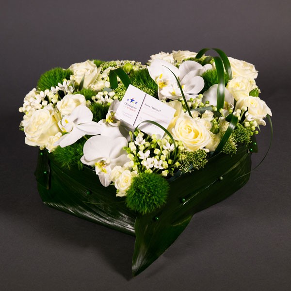 Ravissant cœur d’orchidées travaillé dans des tons blancs et verts.