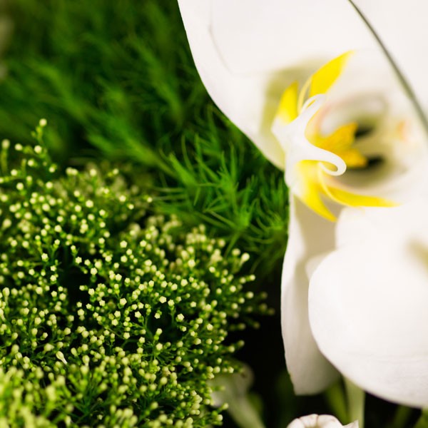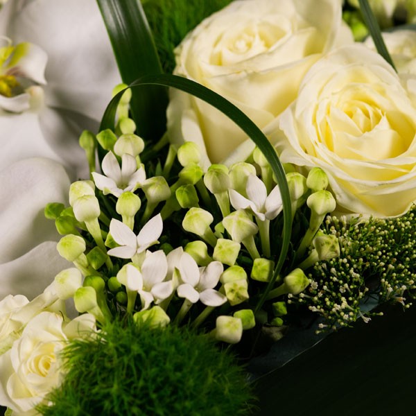 Composition : Roses blanches, œillets verts, orchidées phalaenopsis blanc, bouvardias blancs, ornithogalums, roses branchues blanches, aspidistras et populus.