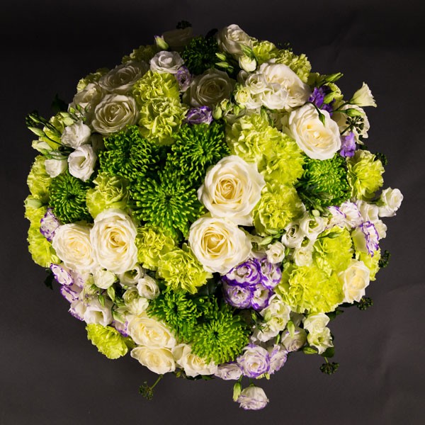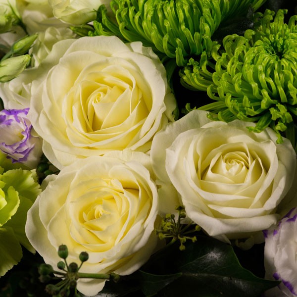 Composition : roses blanches, schamrocks, œillets verts, lysianthus blancs, lysianthus violets, feuillages.