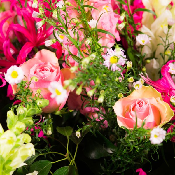 Composition : Mufliers roses, roses roses, aster rose, germinis crèmes, nérines roses, lysianthus, feuillages.