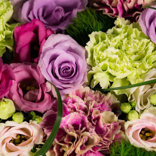 Composition : Roses mauves, œillets verts, œillets roses, ornithogalums, lysianthus roses, feuillages.