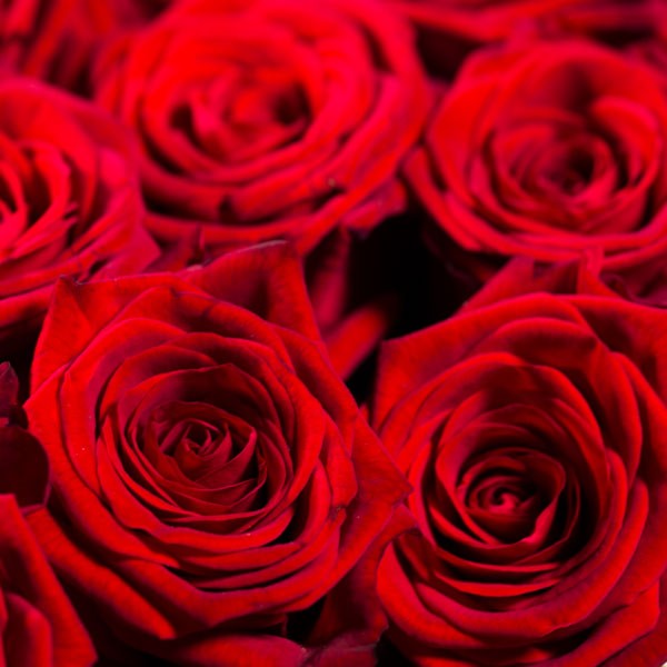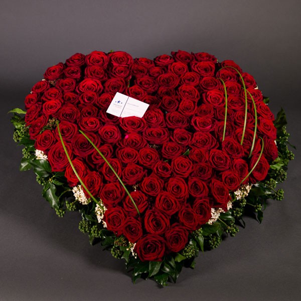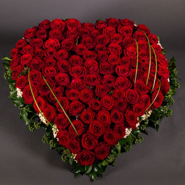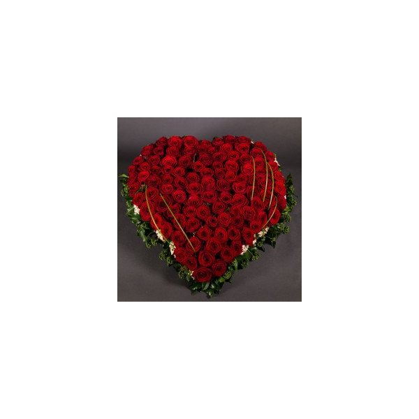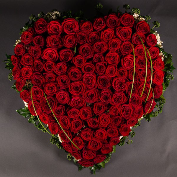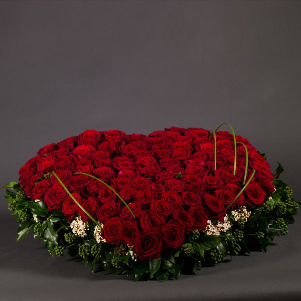 Composition : Roses rouges, lierre, laurier tin et steelgrass.