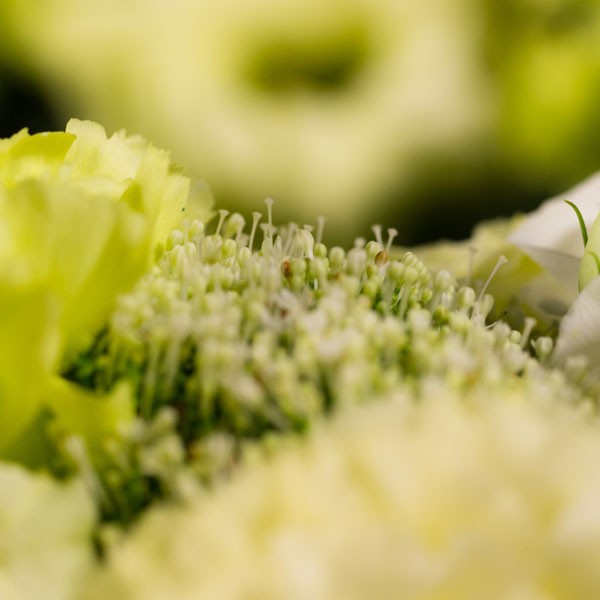 Composition : Roses blanches, œillets verts, lysianthus blancs, lysianthus jaunes, lysianthus verts, trachélium, feuillage d’eucalyptus, steelgrass.