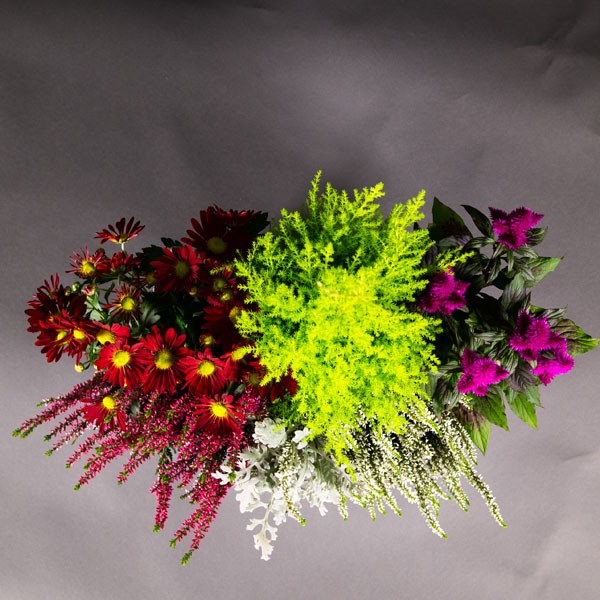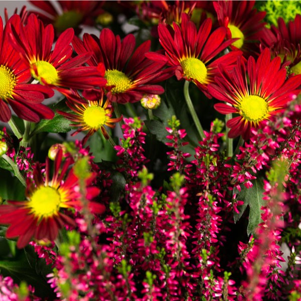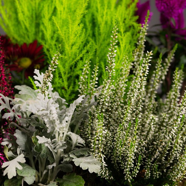 Composition : Plantes vertes et fleuries de saison (chrysanthèmes, bruyères, cupressus, …).