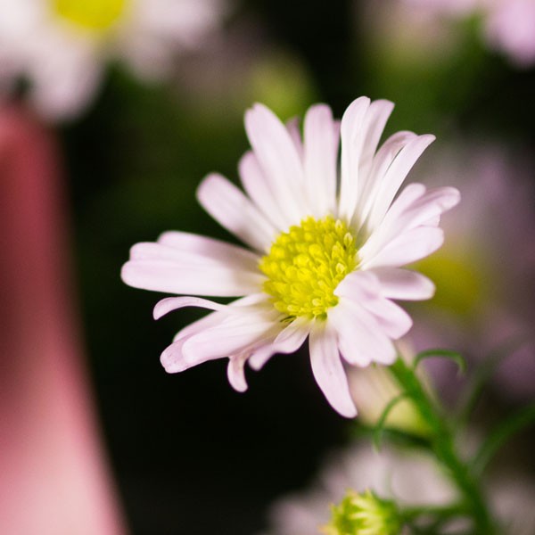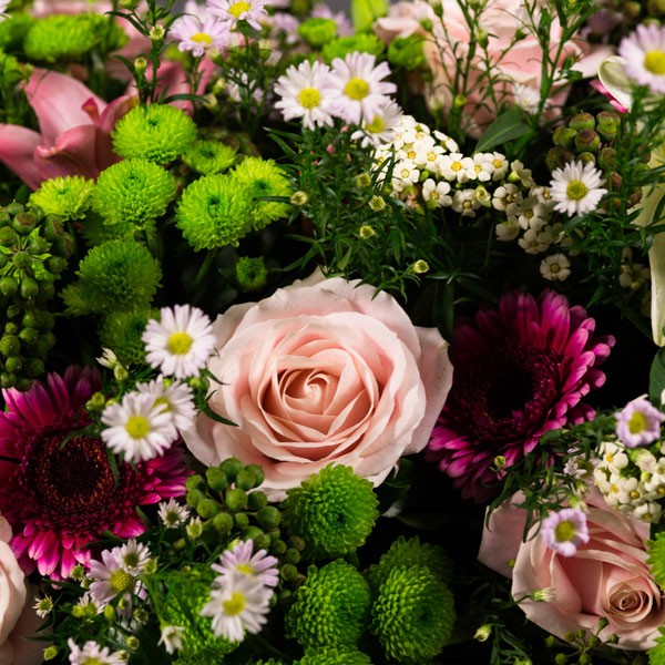 Composition : Roses roses, lys roses, lys longiflorum, germinis fuchsia, asters roses, euphorbe blanche, santinis, feuillages.