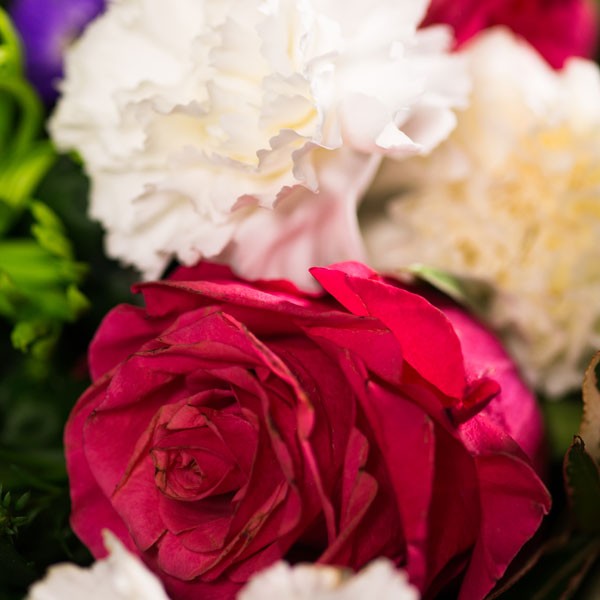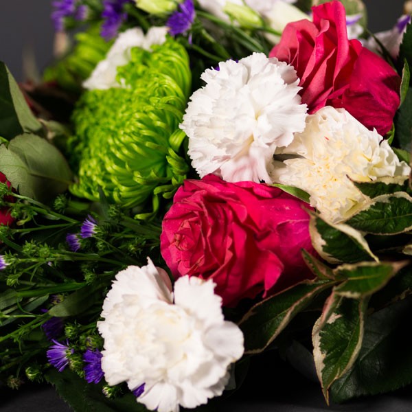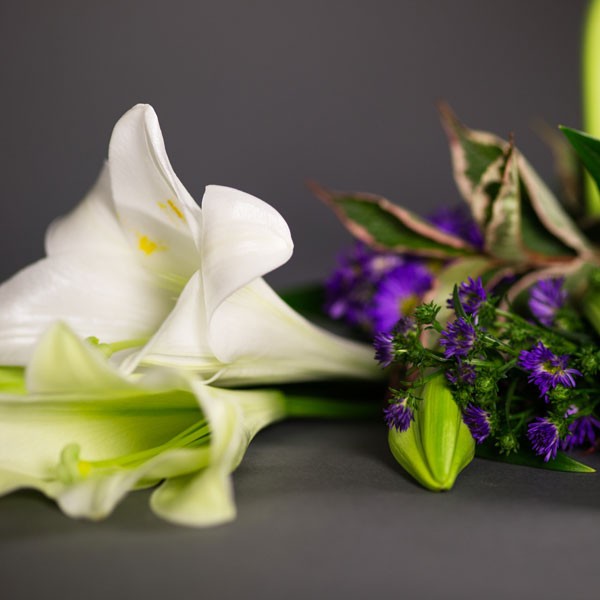 Composition : lys longiflorum, lysainthus blanc picoté de violet, asrer violet, schamrock, oeillets blancs, feuillages.