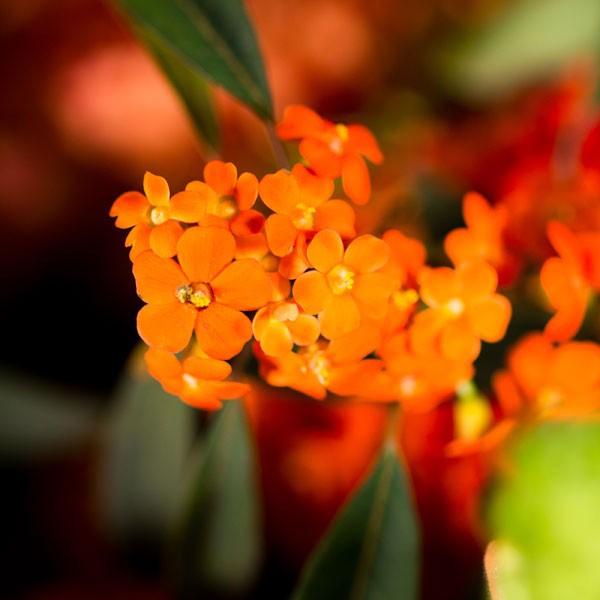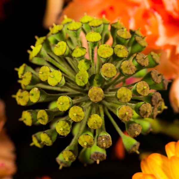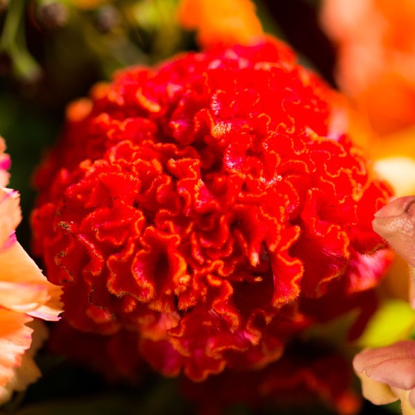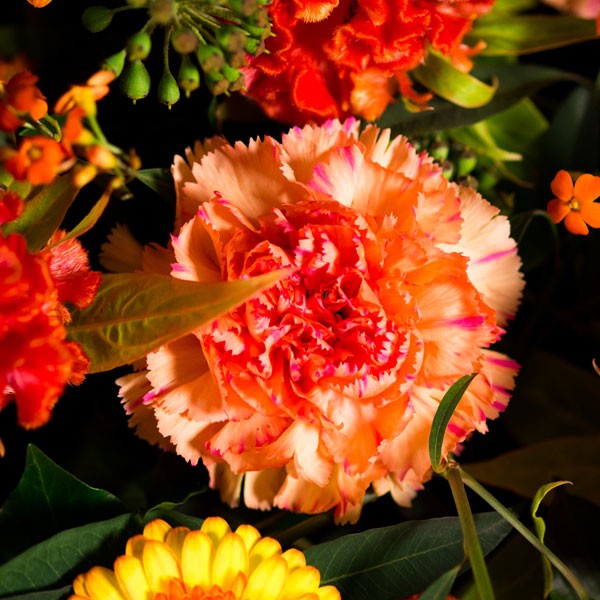 Composition : Mufliers orangés, célosies orangées, euphorbes orangées, œillets et germinis orangés, feuillages.