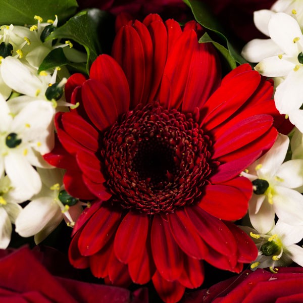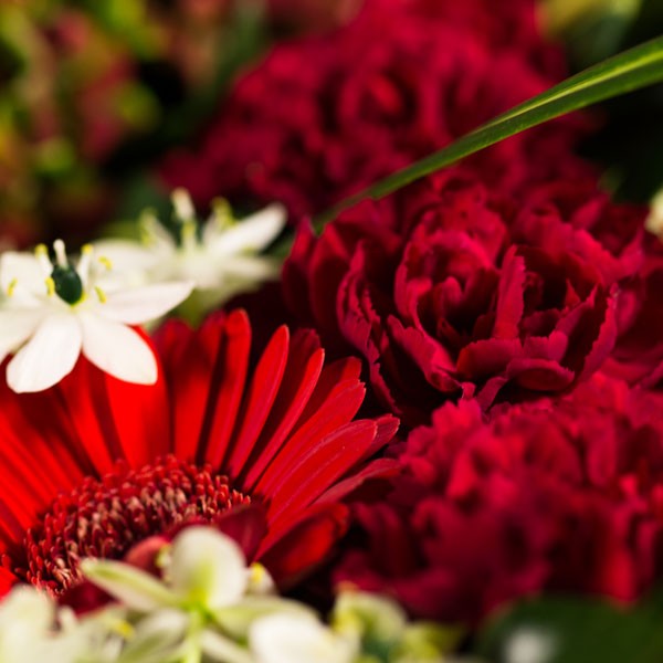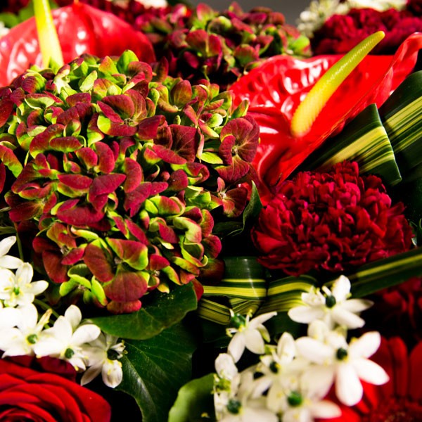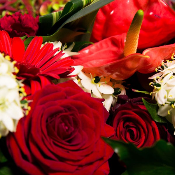 Composition : Roses rouges, œillets rouges, anthuriums rouges, germinis rouges, ornithogalums, steelgrass, pandanus et feuillages.