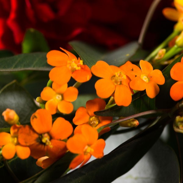 Composition : Mufliers orangés, roses rouges, schamrocks verts, euphorbes orangées, alstromérias, germinis orangés, oeillets orangés, solidago, feuillages.