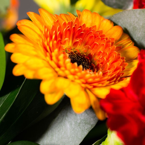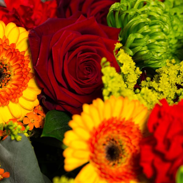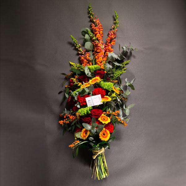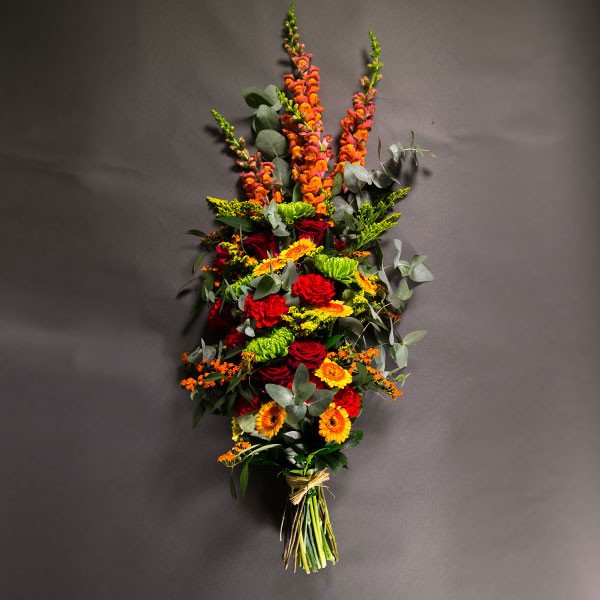 Composition : Mufliers orangés, roses rouges, schamrocks verts, euphorbes orangées, alstromérias, germinis orangés, oeillets orangés, solidago, feuillages.