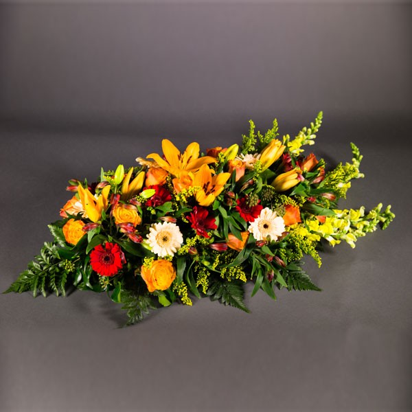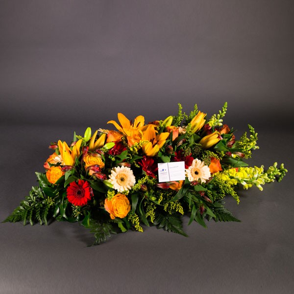 Composition : Mufliers jaunes, lys orangés, roses oranges, solidago, germinis rouges, alstromérias rouges, feuillages.