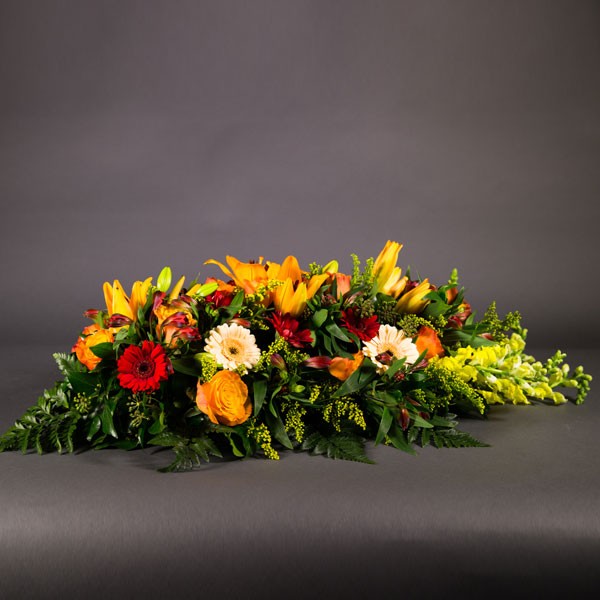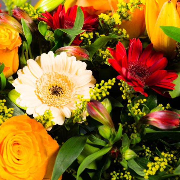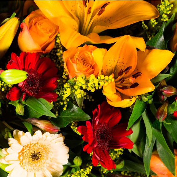 Composition : Mufliers jaunes, lys orangés, roses oranges, solidago, germinis rouges, alstromérias rouges, feuillages.